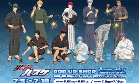藤巻忠俊先生による人気漫画を原作としたTVアニメ「黒子のバスケ」× 株式会社A3によるポップアップストアが、東京キャラクターストリートにて2024年7月5日~7月18日までの期間開催される。黒子や火神・赤司・黄瀬・緑間たちが浴衣に身を包み花火を楽しむ、「夏の夜」をテーマにした描き下ろしイラストグッズが登場!