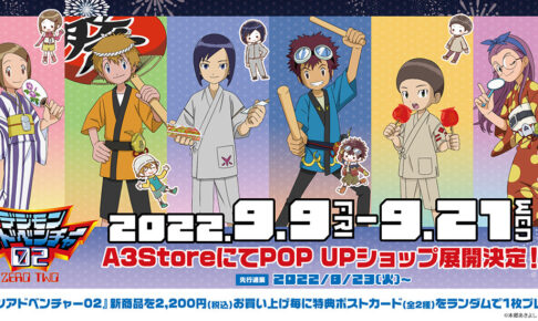 東映アニメーションが手掛ける大人気シリーズの第2作「デジモンアドベンチャー02」× A3のポップアップストアが、A3 Store池袋にて2022年9月9日〜9月21日まで開催される。アニメ「デジモンアドベンチャー02」ポップアップストアでは、描き下ろしイラストを使用した新作グッズが多数ラインナップ!