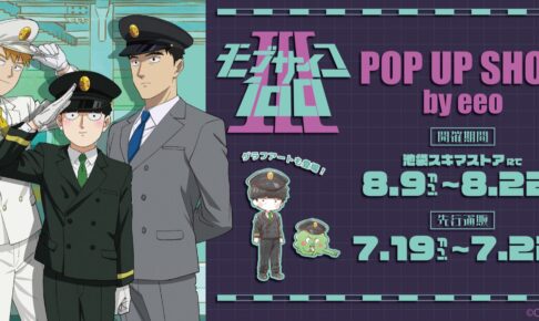 ONE先生による人気漫画を原作としたアニメ「モブサイコ100 Ⅲ」のポップアップストアが、池袋スキマストアにて2024年8月9日〜8月22日まで開催される。駅員に扮したモブ・霊幻新隆・芹沢の描き下ろしイラストを使用したホログラム缶バッジ、アクリルキーホルダー、アクリルスタンドなどのグッズがラインナップ!