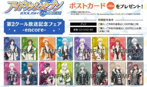大人気ゲームを原作としたアニメ「アイドリッシュセブン Third BEAT!」第2クール放送を記念したフェアが、全国のアニメイトにて2023年2月25日〜3月26日までアンコール開催。「アイドリッシュセブン Third BEAT! 第2クール放送記念フェア-encore-」では、新作グッズ/ノベルティが登場!