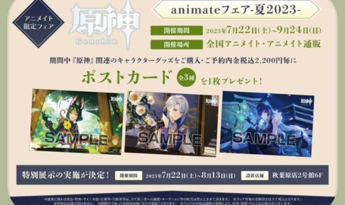 エンターテインメントブランド『HoYoverse』が贈る大人気ゲーム「原神」の『animateフェア-夏2023-』が、全国のアニメイトにて2023年7月22日〜9月24日までの期間限定で開催される。原神グッズを購入・予約内金2,200円(税込)ごとにお買い上げ特典として「ポストカード(全3種)」をプレゼント!