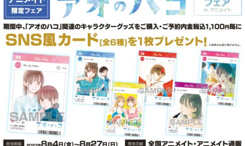 週刊少年ジャンプにて連載中「三浦糀」先生による、青さが胸を衝く青春部活ラブストーリーを描いた漫画の『アオのハコフェア』が、全国のアニメイトにて2023年8月4日〜8月27日までの期間限定で開催される。猪股大喜・鹿野千夏・蝶野雛たちの原作イラストを使用した新作グッズやオリジナルノベルティーが登場!