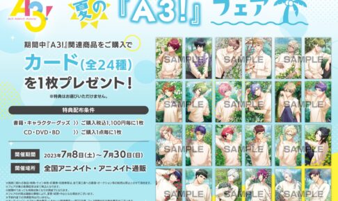 リベル・エンタテインメントが贈る人気ゲーム「A3! (エースリー)」のポップアップフェアが、全国のアニメイトにて2023年7月8日〜7月30日まで開催される。夏の「A3! (エースリー)」フェアと題して、春組・夏組・秋組・冬組らの描き下ろしイラスト「満開memory (開花前)」を使用したグッズ&特典が登場!
