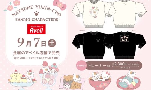 「緑川ゆき」先生による優しさと切なさに溢れた漫画を原作としたTVアニメ「夏目友人帳」× サンリオによるコラボアイテムが、しまむらグループが展開するカジュアルブランド「Avail (アベイル)」全国にて、2024年9月7日より発売!ニャンコ先生とサンリオキャラクターたちがスイーツを楽しむデザインのアイテムが登場!