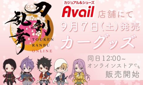 日本刀を擬人化した刀剣男士が活躍する大人気ゲーム「刀剣乱舞 ONLINE」× 「Avail (アベイル)」全国にて、2024年9月7日よりコラボグッズが発!刀剣男士たちをデザインした「サンシェード」や「2枚組足元マット」など、快適なカーライフをサポートしてくれる可愛らしいカーグッズがラインナップ!