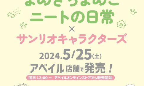 大人気ブログ漫画「まめきちまめこニートの日常」×「サンリオ」によるコラボアイテムが、しまむらグループが展開するカジュアルブランド「Avail (アベイル)」全国にて、2024年5月25日より発売!メロ・シンバ・タビ・こまち達やマイメロ・クロミ・ポムポムプリンたちがコラボしたアイテムがラインナップする。