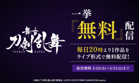DMMゲームズとニトロプラス共同製作による2015年のサービス開始から5周年を迎えた大人気ゲーム「刀剣乱舞 -ONLINE-」を原作とした大人気2.5次元作品舞台「刀剣乱舞 (刀ステ) 」の「虚伝 燃ゆる本能寺」や「悲伝 結いの目の不如帰」など全7作品が2020年5月25日より順次無料配信!