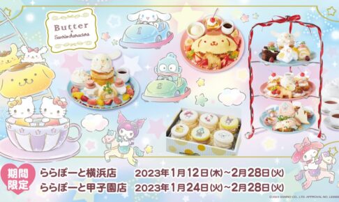 大人気キャラクター「サンリオキャラクターズ」× パンケーキ専門店「Butter」兵庫・ららぽーと甲子園店にて、2023年1月24日〜2月28日までコラボカフェが好評につき追加開催される。”遊園地”をテーマに、ポムポムプリン・シナモロール・クロミ・マイメロディ・ハローキティらのコラボパンケーキが登場!