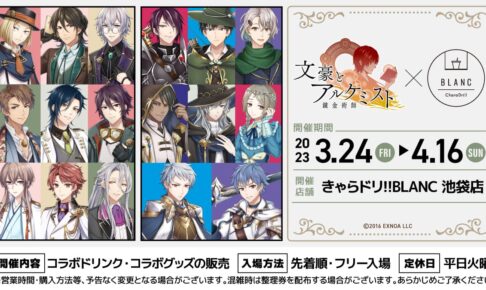DMM GAMESより配信されている人気ブラウザゲーム「文豪とアルケミスト (文アル)」× きゃらドリ!!BLANC池袋にて2023年3月24日〜4月16日までコラボカフェが開催される。キャラクターをイメージしたコラボドリンクがお楽しみいただける他、和風ステンドグラスデザインのコラボカフェ限定グッズが登場!