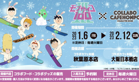 ONE先生による人気漫画を原作としたアニメ「モブサイコ 100 Ⅲ」× コラボカフェ本舗 秋葉原・大阪にて、2023年1月26日より描き下ろしイラストの等身キャラクターにて追加開催される。モブ・霊幻新隆・エクボ・影山律・花沢輝気・芹沢らが、スノーボードを楽しむ描き下ろしイラストを使用した新作グッズが登場!