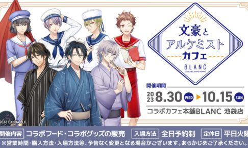 DMM GAMESより配信されているブラウザゲーム「文豪とアルケミスト」× コラボカフェ本舗BLANC 池袋店にて、2023年8月30日〜10月15日までコラボカフェが開催される。作品の世界観やキャラクターをイメージしたコラボメニューがお楽しみいただける他、コラボ限定特典やコラボグッズが販売される。