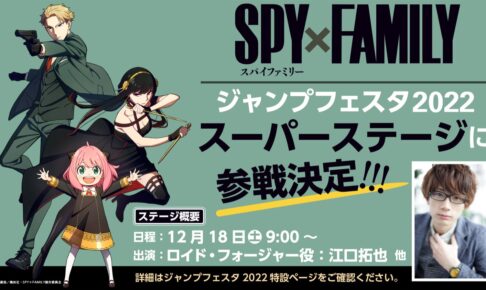 少年ジャンプ+にて連載中「遠藤達哉」先生による人気漫画を原作としたテレビアニメ「SPY×FAMILY (スパイファミリー)」より、ロイド・フォージャー役を務める声優「江口拓也」さんが、2021年12月18日に開催されるジャンプフェスタ2022 のジャンプスーパーステージに出演される。