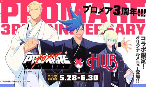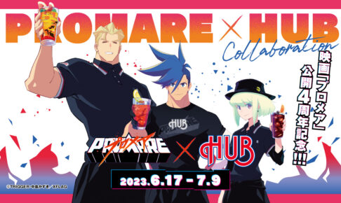 劇場版アニメ「プロメア」映画公開4周年記念 × 英国風パブ「HUB」全国5店舗(秋葉原・池袋・仙台・名古屋・大阪)にて、2023年6月17日〜7月9日までコラボが開催される。ガロ、リオ、クレイら3名の描き下ろしイラストを使用したコースター特典付きコラボメニューと、アクリルスタンドなどのコラボグッズが登場!