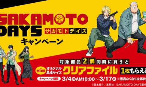 鈴木祐斗先生による、日常×非日常の殺し屋ソリッドアクションストーリーを原作とするTVアニメ「SAKAMOTO DAYS (サカモトデイズ)」× ファミリーマートにて2025年3月4日よりコラボキャンペーン実施!対象商品を購入の方に坂本太郎・シン・南雲がデザインされた「A4クリアファイル」を1枚プレゼント!
