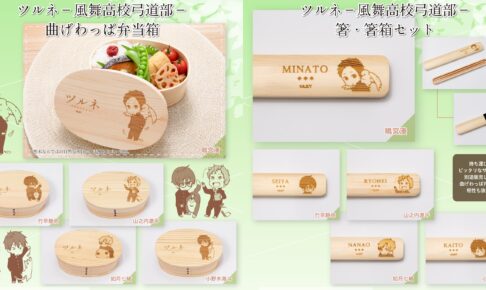 綾野ことこ先生による小説を原作としたアニメ「ツルネ -風舞高校弓道部-」より、描き起こしイラストをデザインした「曲げわっぱ弁当箱」と「箸・箸箱セット」が、2023年5月に発売される。天然木を使用したナチュラルな質感を持つランチグッズは、鳴宮湊・竹早静弥・山之内遼平・如月七緒・小野木海斗の5キャラクターが登場!