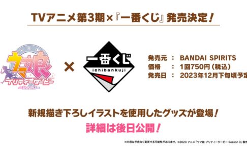 TVアニメ「ウマ娘 プリティーダービー Season3」の新規描き下ろしイラストを使用したオリジナルグッズが当たる「一番くじ ウマ娘 プリティーダービー Season3」が2023年12月下旬より発売される。ラインナップや販売店舗などの詳細は今後、公式サイトやSNSなどにて発表予定!