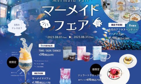 ラグジュアリーブランド「PLACOLE&DRESSY」がプロデュースする、カフェ&バー『DRESSY ROOM&Tea』(鎌倉)と、ウェディングのテーマパークカフェ『DRESSY CAFE -きらめく魔法にかかる空間-』(名古屋)の2店舗にて、2023年8月1日〜8月31日までの期間「マーメイドフェア」が開催。