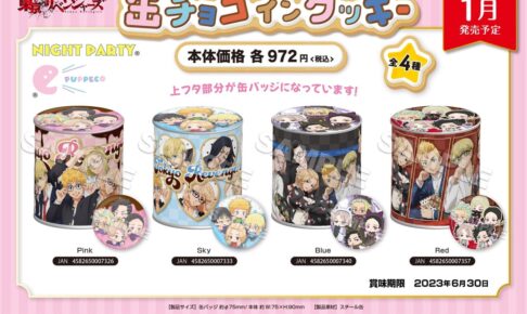 和久井健先生による人気漫画を原作としたTVアニメ「東京リベンジャーズ (東リベ)」のオリジナル缶に入ったチョコ入りクッキーが、2023年1月21日頃より全国のイオン限定で順次発売される。それぞれ絵柄が異なる全4種の缶は、デフォルメイラストをデザインした上フタを75mm缶バッジとしても使える仕様!