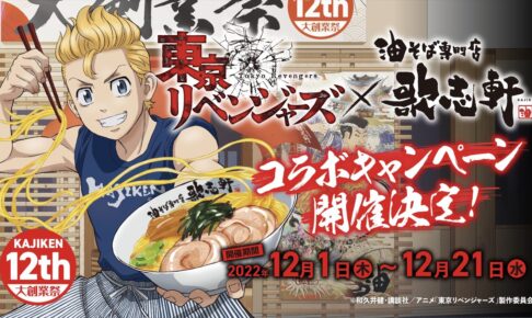 和久井健先生による人気漫画を原作としたTVアニメ「東京リベンジャーズ (東リベ)」× 油そば専門店 歌志軒によるコラボが、2022年12月1日〜12月21日までの期間限定で開催される。「油そば一杯+トッピング1品」を購入されるごとに特典として、コラボ限定ポストーカード1枚をランダムに1枚プレゼント!