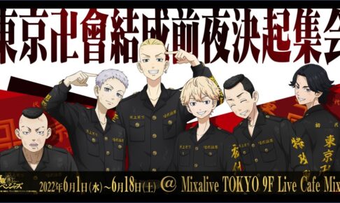 和久井健先生による人気漫画を原作としたTVアニメ「東京リベンジャーズ (東リベ)」× Mixalive TOKYO池袋にて、2022年6月1日〜6月18日までの期間限定で「東リべカフェ」コラボイベント『東京卍會結成前夜決起集会』開催!東京卍會の創設メンバー6人をイメージしたコラボメニューやグッズが登場!