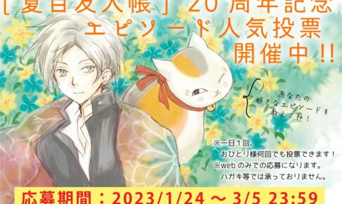 「緑川ゆき」先生による大人気漫画「夏目友人帳」が、LaLa DXに読み切りとして掲載されて今年で20周年を迎えるを記念して、『夏目友人帳 エピソード人気投票』を実施!2023年1月24日〜3月5日 23時59分まで投票を受け付けており、抽選で500名の方に「A4クリアファイル」をプレゼント!