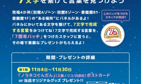優しさと切なさに溢れた「緑川ゆき」先生による漫画を原作とする、TVアニメ「夏目友人帳」× 三省堂書店池袋本店にて、2022年12月26日〜2023年1月15日までの期間限定で、売り場4箇所にあるパネルに書いてある文字を繋げて7文字を完成させるとポストカード or オリジナルグッズをプレゼント!