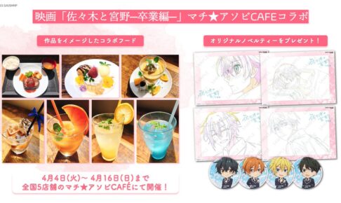 春園ショウ先生による人気漫画を原作としたアニメ映画「佐々木と宮野 -卒業編-」× 全国のマチアソビカフェ6店舗にて、2023年4月4日〜4月16日までコラボが開催される。「佐々木と宮野 × マチアソビカフェ」コラボでは、作中に登場した再現メニュー、原画イラストやミニキャラ絵柄を使用したノベルティをプレゼント!