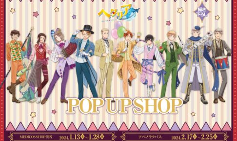 日丸屋秀和先生原作によるアニメ「ヘタリア World★Stars」のポップアップストアが、東京と大阪にて、2024年1月13日〜2024年2月25日まで開催。”サーカス”をテーマに、イタリア・ドイツ・日本・アメリカ・イギリス・フランス・ロシアら10名が、華やかな衣装に身を包んだ描き下ろしイラストのグッズが登場!