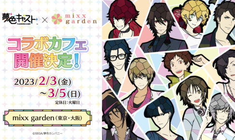 セガゲームス&マイネットによる恋するミュージカルリズムゲーム「夢色キャスト」× mixxgarden 東京・大阪にて2023年2月3日〜3月5日までコラボカフェが開催される。「夢色キャスト」コラボカフェでは、「夢キャス」のキャラクターたちをイメージしたオリジナルコラボメニューや、限定デザイングッズが登場!