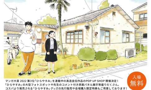 真造圭伍先生による5作品のポップアップストア『ひらやすみ ポップアップストア』が、ジーストア5店舗にて2023年9月23日を皮切りに開催される。スパより発売される「ひらやすみ」の先行販売グッズや、グッズを2,000円(税込)以上購入すると特典として貰える「描き下ろしイラストポストカード 全1種」が登場!