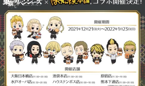 和久井健先生による人気漫画を原作としたTVアニメ「東京リベンジャーズ (東リベ)」× ばくだん焼本舗 全国6店舗(池袋・原宿・大阪・茨城・長崎・熊本)にて、2021年12月21日〜2022年1月23日までコラボ開催!マイキー・ドラケン・三ツ谷・千冬・場地さんらに加え、パーちん・ぺーやん・半間・稀咲も登場!