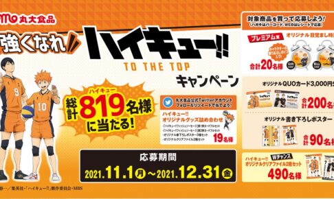 古舘春一先生による大人気漫画を原作としたTVアニメ「ハイキュー!!」× 丸大食品とのコラボレーションより計819(ハイキュー)名の方に、コラボ限定の描き下ろしイラストを使用したグッズが当たるキャンペーンを2021年12月31日まで実施中。Twitterでは19名の方にグッズ詰め合わせをプレゼント!