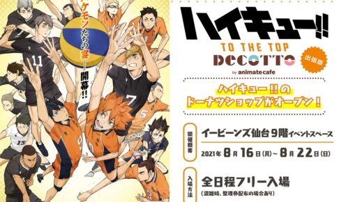 古舘春一先生による漫画原作のTVアニメ「ハイキュー!!」× デコット by アニメイトカフェの「ハイキュー!! ドーナツショップ」が、イービーンズ仙台にて2021年8月16日〜8月22日まで出張版を開催!コラボドーナツに加え、日向・影山・ツッキー・山口・黒尾・研磨・宮兄弟・北さんらのグッズや特典が登場!