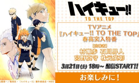 週刊少年ジャンプにて連載中「古舘春一」先生による人気漫画が原作のTVアニメ第4期が大好評放送中「ハイキュー!! TO THE TOP」の春高突入特番が2020年3月21日18時より配信!烏野高校より村瀬歩さん、石川界人さん、稲荷崎高校より宮侑役の宮野真守さん、宮治役の株元英彰さんらが出演!お見逃しなく!