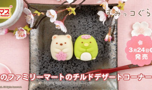 サンエックスが贈る大人気キャラクター「すみっコぐらし」× バンダイの和菓子シリーズ「食べマス」によるすみっコぐらしの食べマスがファミリーマート全国にて2020年3月24日より発売!春限定のお花見がテーマの可愛い食べマスは「しろくま」と「ぺんぎん?」の2個入り。しろくまがいちご味、ぺんぎん?がカスタード味!