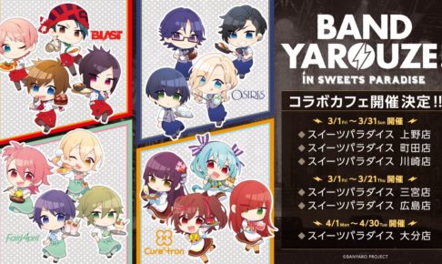 リズムゲーム「バンドやろうぜ!」× スイーツパラダイス全国6店舗(上野・町田・川崎・京都・広島・大分)にて2019年3月1日を皮切りにコラボ第2弾となる「バンやろ」コラボカフェ開催!バンやろをイメージしたコラボメニューの注文で限定ノベルティーをプレゼント!さらに描き下ろしイラストを使用したオリジナルグッズも!