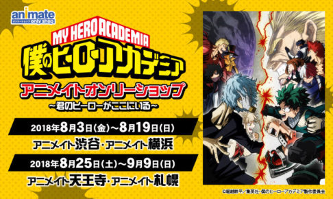 僕のヒーローアカデミア × アニメイト全国4店舗(札幌・渋谷・天王寺・横浜)にて渋谷・横浜の8月3日を皮切りにヒロアカの「アニメイトオンリーショップ ~君のヒーローがここにいる~」開催!開催期間はアニメイト渋谷・横浜が2018年8月3日〜8月19日まで、アニメイト天王寺・札幌は2018年8月25日〜9月9日まで!