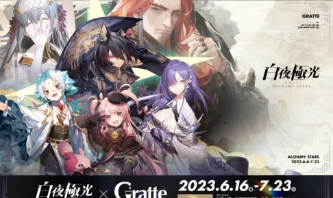 スマートフォン向けゲームアプリ「白夜極光」× アニメイトカフェGratte (グラッテ) 8店舗 (秋葉原本館/池袋本店/仙台/吉祥寺パルコ/渋谷/岡山/大阪日本橋/横浜ビブレ) にて2023年6月16日〜7月23日までコラボカフェが開催される。人気キャラクターより20絵柄をグラッテメニューで再現!