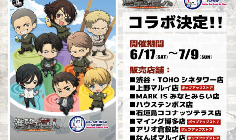 諫山創先生による人気漫画を原作としたアニメ「進撃の巨人」× 全国のロールアイスクリームファクトリー8店舗にて、2023年6月17日〜7月9日までコラボカフェが開催される。エレン・ミカサ・アルミン・リヴァイらをイメージしたコラボアイス、描き起こしミニキャライラストを使用したコラボグッズもラインナップ!