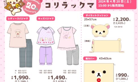 白いクマの人気キャラクター「コリラックマ」20周年記念 × ファッションセンター「しまむら」オンラインにて、2024年4月20日15時よりコラボグッズが発売される。レディースとキッズサイズの「コリラックマ パジャマ」と、コリラックマの顔でデザインされた「ダイカットクッション」「枕カバー」がラインナップ!