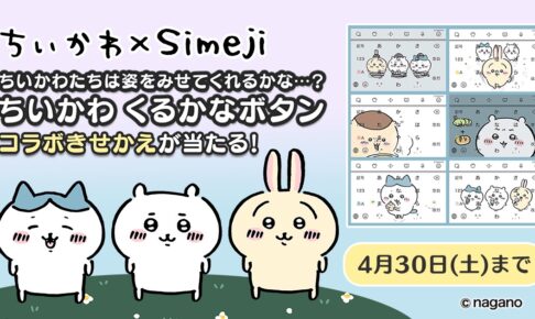 SNSで大人気を誇るイラストレーター・ナガノ先生による「ちいかわ」× 日本語文字入力アプリ「Simeji (しめじ)」によるコラボ実施!2022年3月31日〜4月30日までの期間限定で特設サイトに、コラボきせかえが当たる『ちいかわくるかなボタン』が登場!サプライズプレゼントが貰える秘密のコードも!