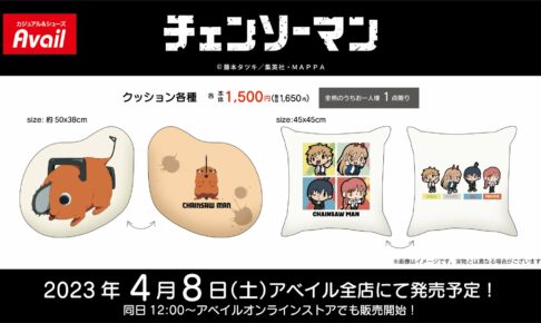 藤本タツキ先生原作のアニメ「チェンソーマン」× カジュアルブランド「Avail (アベイル)」全国にて、2023年4月8日よりコラボアイテムが発売される。ポチタ・デンジ・早川アキ・マキマ・パワーらのミニキャライラストを使用した「チェンソーマン クッション 全2種 各1,650円(税込)」がラインナップ!