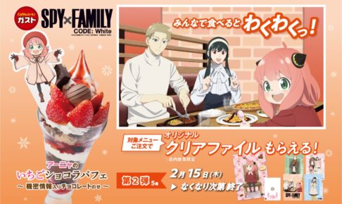 遠藤達哉先生による人気漫画を原作としたテレビアニメの劇場版「SPY×FAMILY CODE: White」× ガストにて実施されているコラボキャンペーンの第2弾が、2024年2月15日より開催!対象メニューを注文すると特典として貰えるオリジナルノベルティー「A4クリアファイル」の第2弾絵柄が登場!