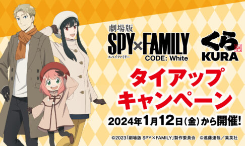 遠藤達哉先生による人気漫画を原作としたアニメ映画「劇場版 SPY×FAMILY CODE: White」× 全国のくら寿司にて、2024年1月12日よりコラボキャンペーンが実施される。お会計金額2,500円(税込)ごとに、特典として「クリアファイル (全4種)」や「クッションチャーム (全4種)」をプレゼント!