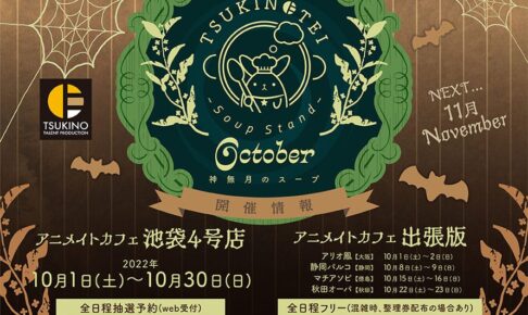 「ツキノ芸能プロダクション」所属タレントの公式カフェ「月野亭」が、アニメイト池袋4号店などにて1年間限定で開催中のスープスタンド「TSUKINOTEI ~Soup Stand~」の2022年10月開催情報が解禁され、お当番タレントが発表!10月は水無月 涙をはじめ、全7名のタレントが当番となる。