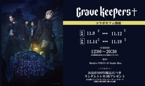 オリジナル舞台「Grave Keepers」× Mixalive TOKYO (ミクサライブ東京)にて2023年11月9日〜11月19日までコラボカフェが開催される。「Grave Keepers」コラボカフェでは、キャラクターモチーフのドリンクや会場限定菓子メニュー、等身大パネル・スクリーン展示などが登場!