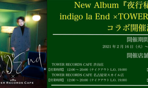 川谷絵音、長田カーティス、後鳥亮介からなる「indigo la End」の6thフルアルバム「夜行秘密」リリース記念!「indigo la End」× タワーレコードカフェ全国4店舗(渋谷/名古屋/札幌/梅田)にて2021年2月16日〜3月3日までの期間限定で「indigo la Endカフェ」開催!