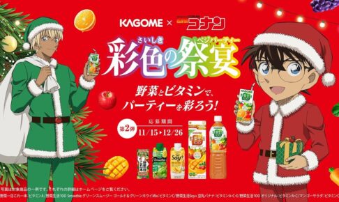 週刊少年サンデーにて連載中「青山剛昌」先生の大人気漫画を原作としたTVアニメ「名探偵コナン」× カゴメによる「彩色の祭宴 (さいしきのベジパーティー)」キャンペーンが2021年12月26日まで開催中。本キャンペーンの新TVCMでは、コナンと安室の撮り下ろしボイスを聴くことができる。