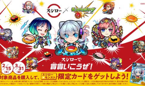 XFLAGが贈るスマホアプリのひっぱりハンティングRPG「モンスターストライク (モンスト)」× 全国のスシローにて、2023年2月15日より「モンストコラボ」を実施!対象商品を購入すると特典としてオリジナルデザインを使用した「限定カード (全10種)」をプレゼント!さらに、抽選で当たる「オリジナルすし皿」も!