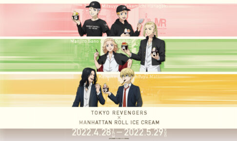和久井健先生による人気漫画を原作としたTVアニメ「東京リベンジャーズ (東リベ)」× マンハッタンロールアイスクリーム8店舗にて、2022年4月28日〜5月29日までの期間限定でコラボレーションを開催!キャラをイメージしたアイスを提供する他、描き下ろしイラストを使用した特典プレゼントやグッズ販売が実施される。